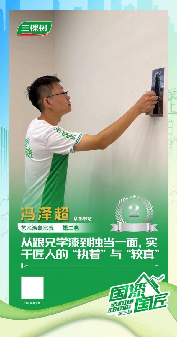 九月的邯郸,古赵秋色映丹枫。在2025三棵树“国漆国匠”第三届全国建筑涂装职业技能大赛邯郸站的赛场上,一位匠人凭借其独特的专注力与对细节的执着征服了评委——他就是艺术涂装赛道银牌匠人冯泽超。当荣誉降临,这位平日里默默与墙面打交道的匠人,展现出的不仅是精湛技艺,更是融于骨血的专业态度。赛后,网易家居与他展开对话,探寻这位匠人如何将个人特质融入每一道工序,打造出令人赞叹的作品。
