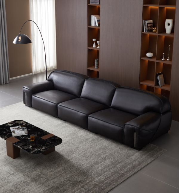 复古黑色调搭配饱满座包,如琴键般静谧舒适,松弛感自然流露。1.5mm进口头层牛皮,色泽持久,柔韧耐用。分段式靠包设计,精准承托头颈腰背,倚靠更舒适。37cm加宽扶手,便于置物与搭手。座包、靠包与扶手填充三层海绵,柔弹释压,倚靠更放松。