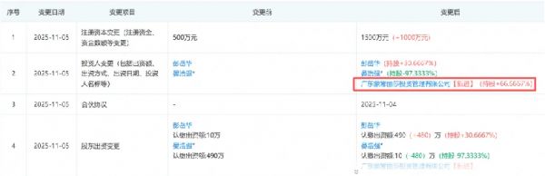 11月12日,珠海晶瓷电子科技有限公司(以下简称“珠海晶瓷”)发生投资人变更,其中,珠海横琴晶途投资合伙企业(有限合伙)认缴出资额1500万元,持有珠海晶瓷75%股份,成为珠海晶瓷的控股股东。