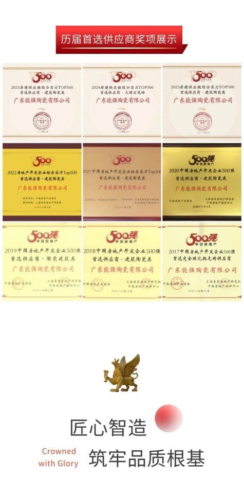 连续十年蝉联行业首选供应商,是能强瓷砖对「品质为先」理念的最好诠释。在竞争激烈的建筑陶瓷市场中,能强始终坚守品质底线,以创新驱动发展,以服务赢得市场,用一块块高品质瓷砖铺就了品牌的成长之路,也为中国建筑陶瓷行业树立了品质标杆。 未来,能强瓷砖将继续以匠心智造、匠心服务、匠心品质为内核,持续为客户创造更大价值,书写建筑陶瓷领域的崭新篇章。