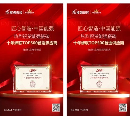 广东能强陶瓷有限公司凭借强大的品牌实力与行业口碑,一举斩获「建筑陶瓷类」与「岩板类」TOP500首选供应商双料大奖。这是能强瓷砖连续第十年获此殊荣,不仅是行业对能强产品与服务的高度认可,更是品牌深耕建筑陶瓷领域的实力见证。