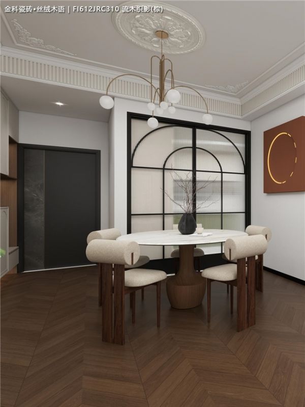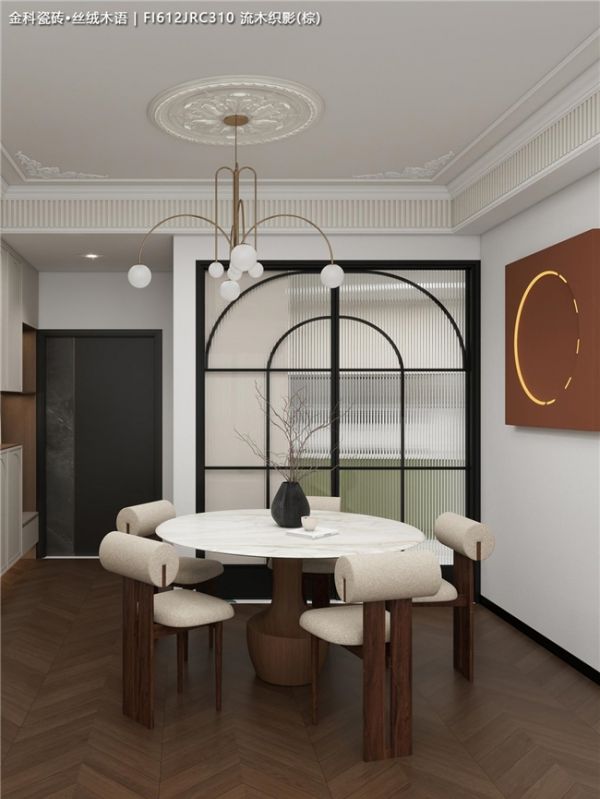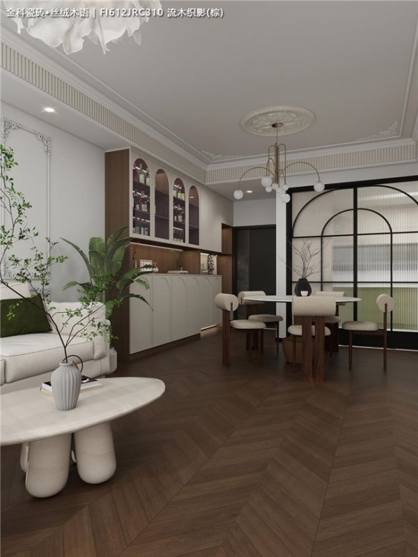 全屋通铺暖棕色鱼骨拼木纹砖,独特的“V”字形纹理像流动的琴键,从客厅延伸到餐厅,让整个空间有了明确的指向性和纵深感✨。比起人字拼,鱼骨拼的拼接更规整精密,极好地契合法式风格的精致与秩序感。