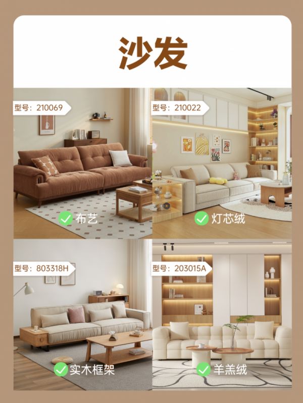 布艺材质透气亲肤,灯芯绒面料复古优雅,羊羔绒触感软糯舒适。再搭配沉稳耐用的实木框架,居家时光更惬意。